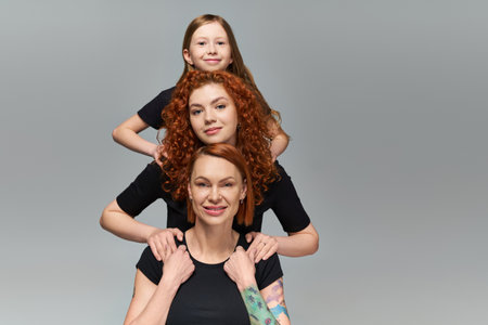 female generations concept, happy redhead family in matching attire hugging on grey background