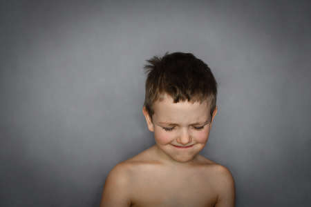 Close up portrait cute smiling blue eyed freckled blond boy artistic facial expressions, gestures funny mischievous in happy mood. Childhood, children education psychology behaviour problems concept