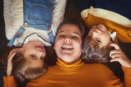 Top view portrait of small family lying on blue carpet in living room looking happy together