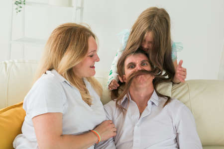 twin daughters are trying to divide their father, childish jealousy. Dad playing at home with children