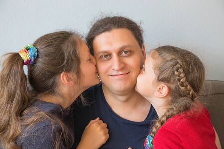 Children kiss father. Two little girls kiss dad on both cheeks. Father day concept.