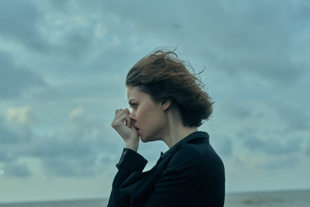 Woman in a dark coat stands by the sea, wind tousling hair under a cloudy moody sky, capturing a contemplative outdoor moment with dramatic coastal weather.