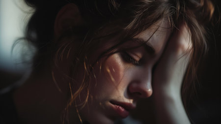 A young woman with disheveled hair clutches her head in despair, sitting in a shadowy environment that enhances the feeling of anxiety and distress.