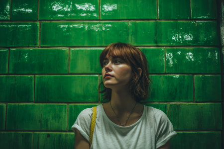 A young woman with short, wavy hair gazes thoughtfully to the side while standing against a vibrant green tiled wall. The setting evokes a calm urban atmosphere in the evening.
