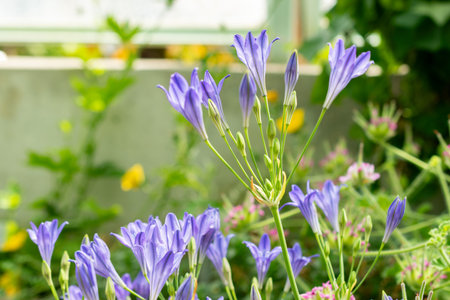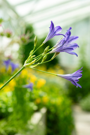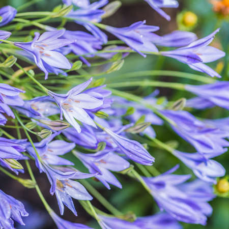 Purple blue Agapanthus flowers bloom on a background of green in a botanical garden in spring.