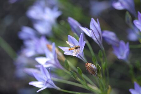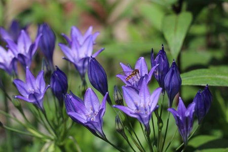 hoverfly visiting purple triteleia flowers on a sunny day