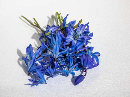 Spring blue Scilla siberica (Siberian squill or wood squill) on white background. Beautiful blue isolated flowers on white. Beautiful and delicate background