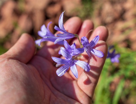 Blue flower in hand in spring steppe.