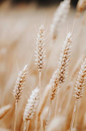This close-up captures the intricate details of several golden wheat ears swaying gently in the warm sunlight. The stalks and individual grains are rendered in rich shades of yellow and brown, illuminated by a soft, golden light that creates a serene and peaceful atmosphere. The shallow depth of field blurs the background, emphasizing the texture and form of the wheat. evokes a sense of harvest, agriculture, and the natural beauty of a sun-drenched field.