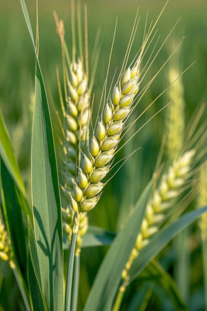 Close up of green wheat ears in a field. Selective focus.