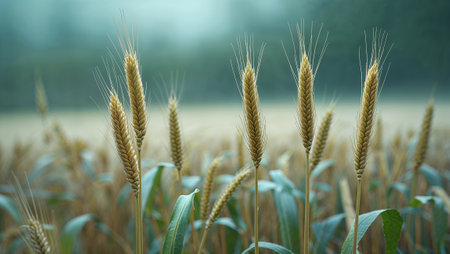 Ripe wheat stalks growing in a field on a misty morning, ready for harvest. Ai generated image
