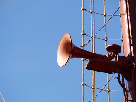 Megaphone mounted on a ship's railing, ready for emergency alarms. Captures the essential equipment used to alert crew and passengers during critical situations. -