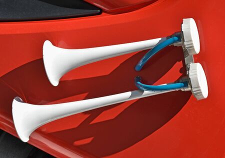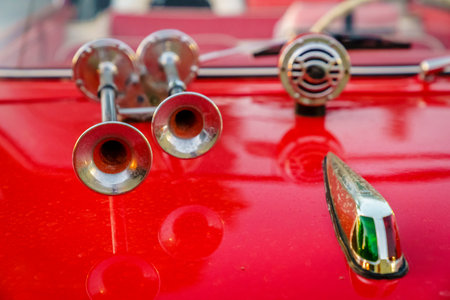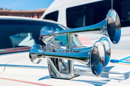 Close up shot of a vintage car double horn.