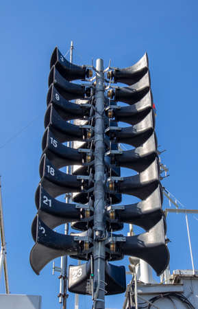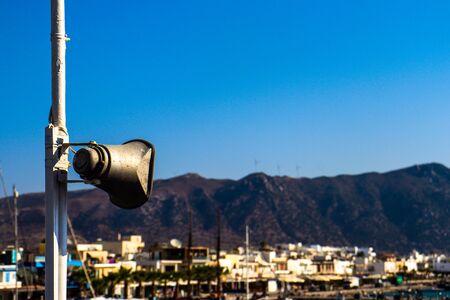 Loudspeaker on the mast of a ship against the blue sky