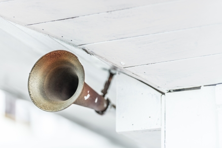 Close up view of old grungy metal horn on ship under old white wooden ceiling Sound signal during sea travelling Way of warning or informing passengers about danger Safety on board