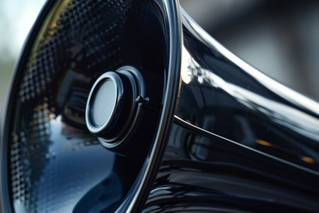 A shiny black microphone with a white button in the center. The microphone is designed to amplify sound and is often used in public speaking events or concerts