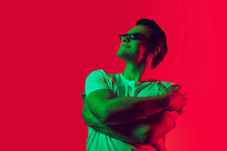 Stylish. Caucasian mans portrait isolated on red studio background in multicolored neon light. Beautiful male model. Concept of human emotions, facial expression, sales, ad, fashion. Copyspace.