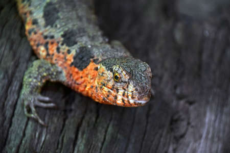 Close up portrait of Chinese crocodile lizard on tree (Shinisaurus crocodilurus), high angle view