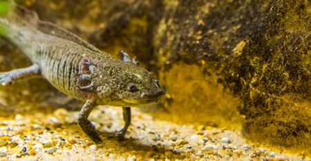 closeup of a grey axolotl, mexican walking fish, tropical underwater amphibian from mexico, critically endangered animal specie