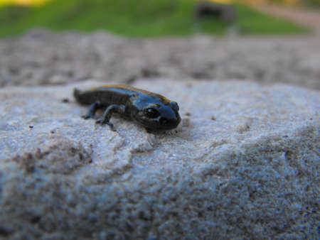 Beautiful Fire salamander lizard close-up. A rare animal creeps on a stone. The representative of the Carpathian fauna in a natural habitat