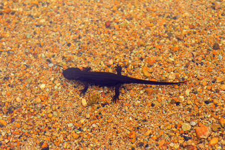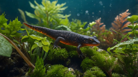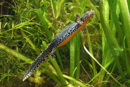 Graceful smooth newt swimming in shallow water with orange patches and paddle like tail