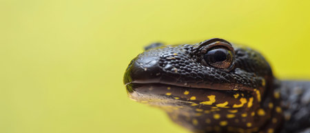 A close-up shot of a black and yellow salamander's face. The salamander's eye is focused, looking intently at something off-camera. The salamander's skin is textured and patterned, with black and yellow markings. The background is a blurred yellow.