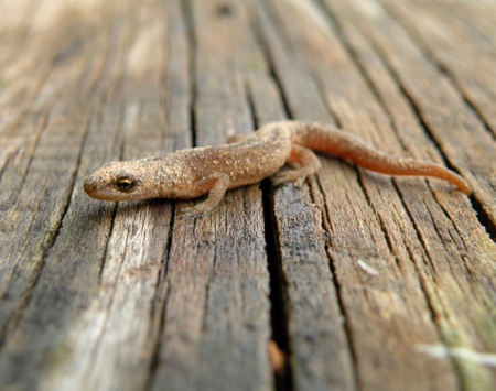 Full body closeup on the endangered Oita salamander Hynobius dunni sitting a piece of wood