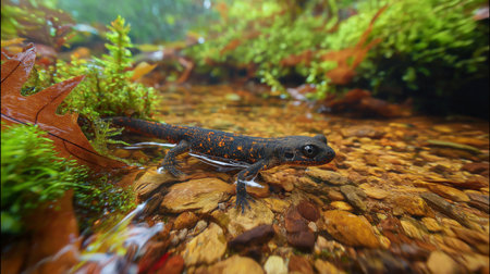 salamander on a mossy rock beside a burbling stream, created with generative ai