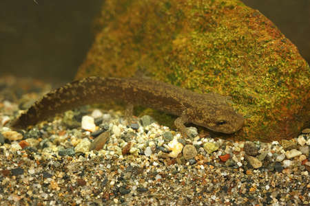 Great crested newt on the rock, Triturus cristatus, Bieszczady Mountains, Carpathians, Poland.
