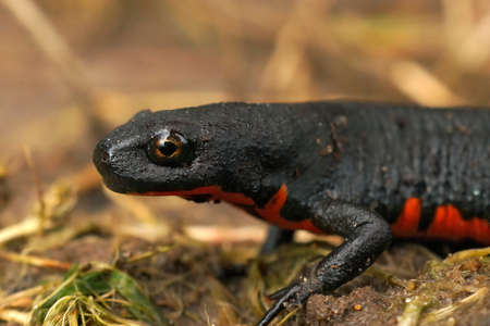 Closeup on a terrestrial female black Chinese fire-bellied newt, Cynops orientalis on the ground