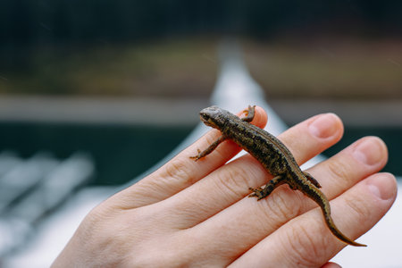 A small lizard rests gently on a human hand, captured outdoors with a blurred blue background. The detail highlights the creature's textured skin.