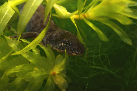 A closeup of an aquatic female Greek alpine newt, Ichthyosaura alpestris veluchiensis, hiding among the water weeds