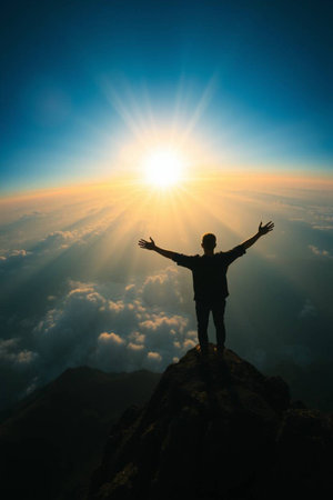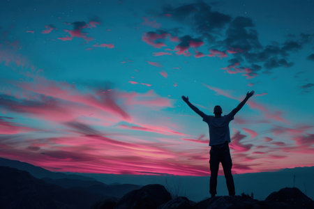 A person stands with arms outstretched, silhouetted against a vibrant sunset. The image showcases a warm color palette with hues of orange, yellow, and blue. The composition emphasizes a sense of openness and vastness, potentially suitable for themes related to achievement or aspiration. It can be used for various editorial and commercial purposes.