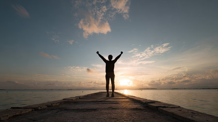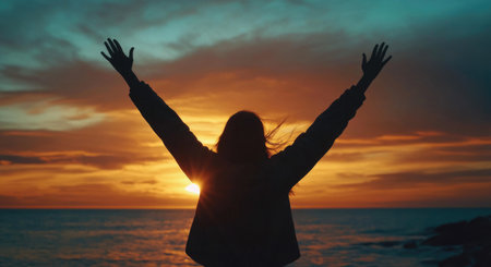 Silhouette of a woman with raised arms against a sunset sky over a sea background.