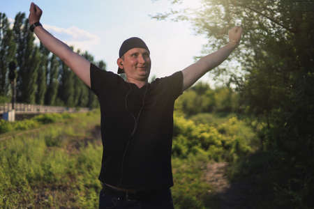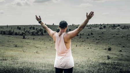 A man in nature with his arms outstretched to the sides, a man demonstrates freedom, a young man is happy in nature in a field in a meadow.