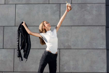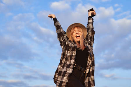 Success, freedom or triumph concept. Cute attractive caucasian elegant girl dancing against blue cloudy sky. Online shopping, shopaholic or discounts. High quality image