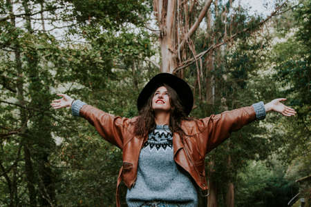 young woman enjoying autumn in the woods