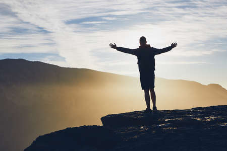 Silhouette of a man on the top of the mountain with his hands up