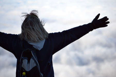 Hands up silhouette in sunny sky background. Rear view. Sunrise at the morning.