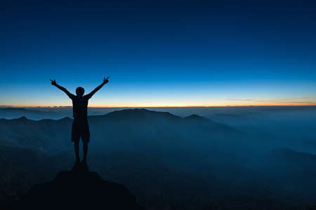 Silhouette of man spreading hand and enjoy to see Night mountains before sunrise in Kanchanaburi, Thailand.
