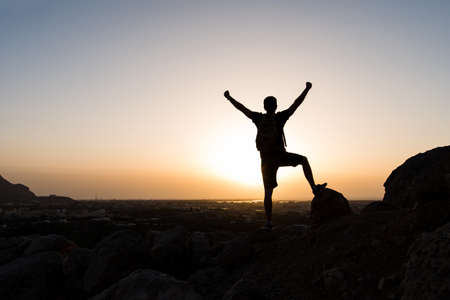 Hiker on the mountain top facing the sunset, silhouette shoot