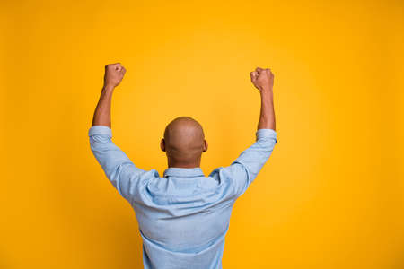 BEhind photo of dark skin guy raised hands up support favorite football team wear jeans denim shirt isolated bright yellow background