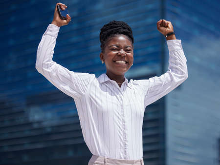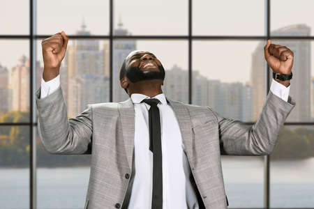 The businessman's victory. Happy manager in the office. Black man celebrating sucess. Business success in the capital.