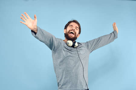 man wearing headphones music emotion lifestyle modern style technology blue background