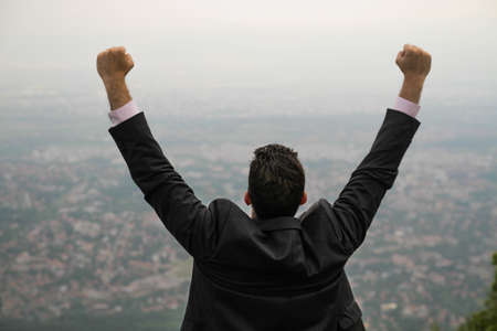 View from behind of a successful young businessman standing under the