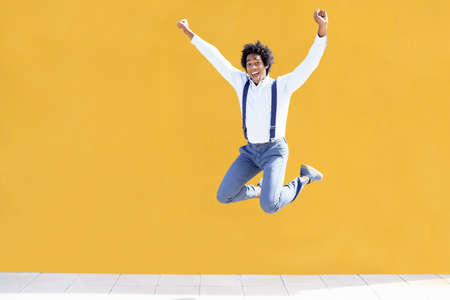 Black man with afro hair jumping on a yellow urban background