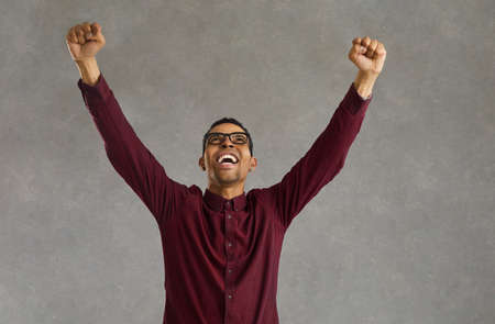 Young african american man screaming clenching fist standing with raised hands up looking up studio shot. Black guy celebrating win, rejoicing success and goal achievement. People positive emotion