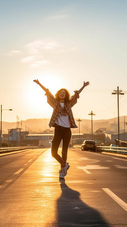 I believe I can fly Beautiful young smiling woman roller skating along the road and stretching out her hands : Generative AI