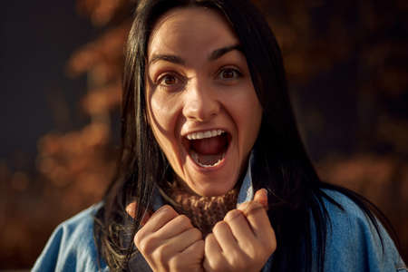 Close up portrait of a young adorable woman yelling happily while holding tightly the collar of her denim jacket