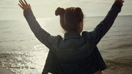 Young girl dancing beach. Adorable kid playing alone on sunny day sea shore sand close up. Playful child enjoying fun summer in beautiful dress on holiday family vacation. Childhood leisure concept.